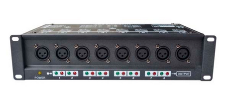 8路信号放大器是采用最新光电隔离技术,达到国际先进水平,输入输出每路都是采用独立的变压器供电,八个光电隔离信号放大来扩大DMX信号输出 ,放大功能可以令连接延长超过标准的DMX512长度。外观设计轻便,结构坚固,减少问题再发生.是舞台电脑灯,LED灯,灯控台的最佳搭档。